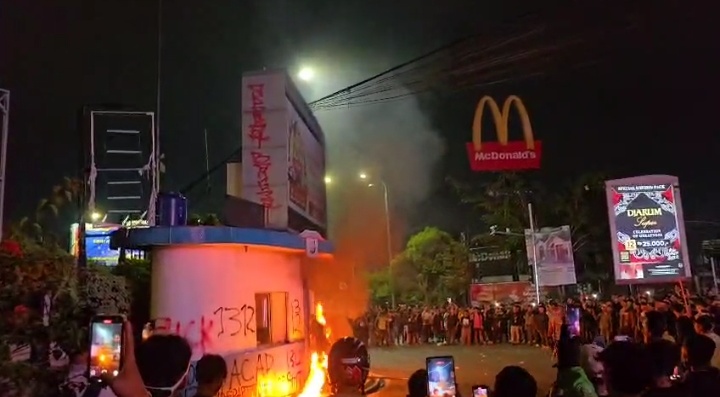 BANTEN-, Aksi massa di Kota Serang, Sabtu (30/8/2025) berlangsung ricuh. Dalam video yang beredar nampak massa aksi membakar Pos Polisi yang berada di Lampu Merah Ciceri, Kota Serang.